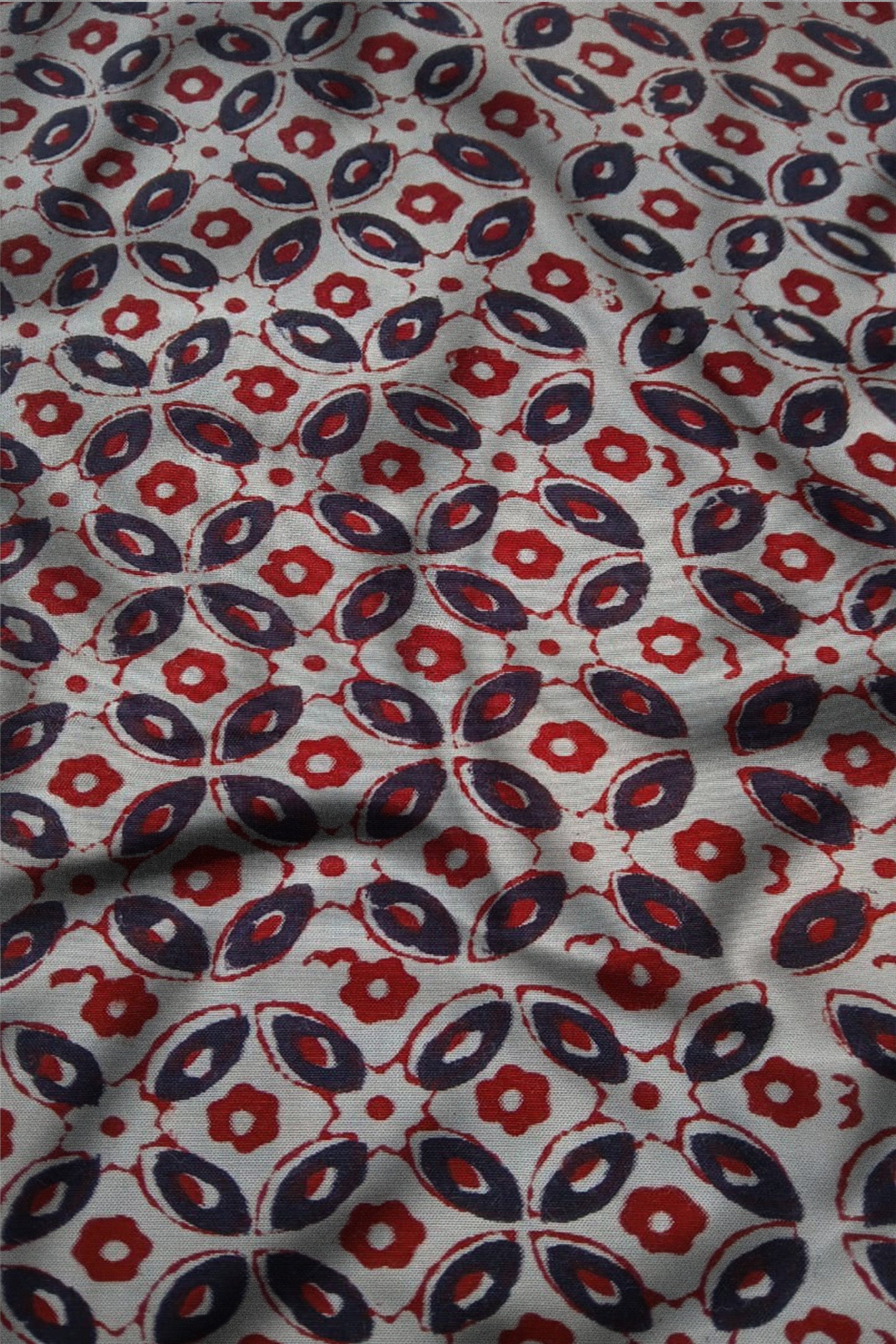 A traditional hand-block art featuring geometric patterns in natural red and black vegetable dyes. It combines tribal heritage with machine-like precision for a timeless, artisanal look.