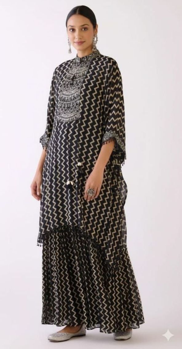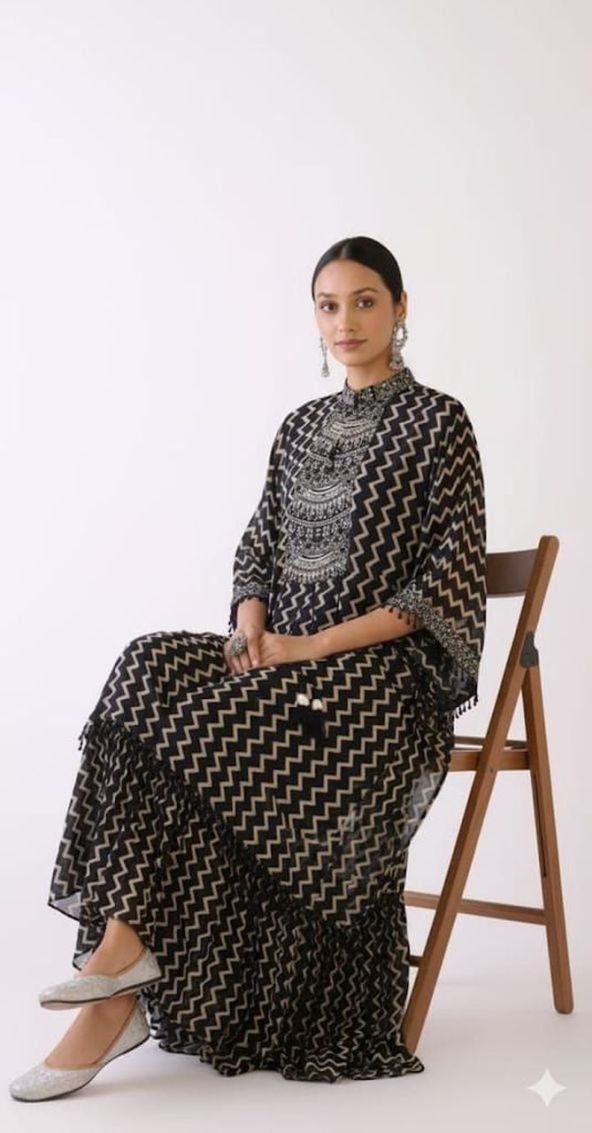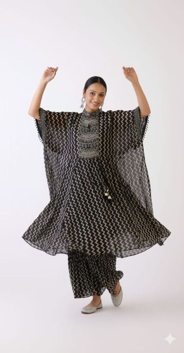 Effortless chic 😊! Our black georgette printed kaftan-style top with pants features beautiful handwork detailing 💃. Perfect for a relaxed evening out or a stylish staycation 🌸.