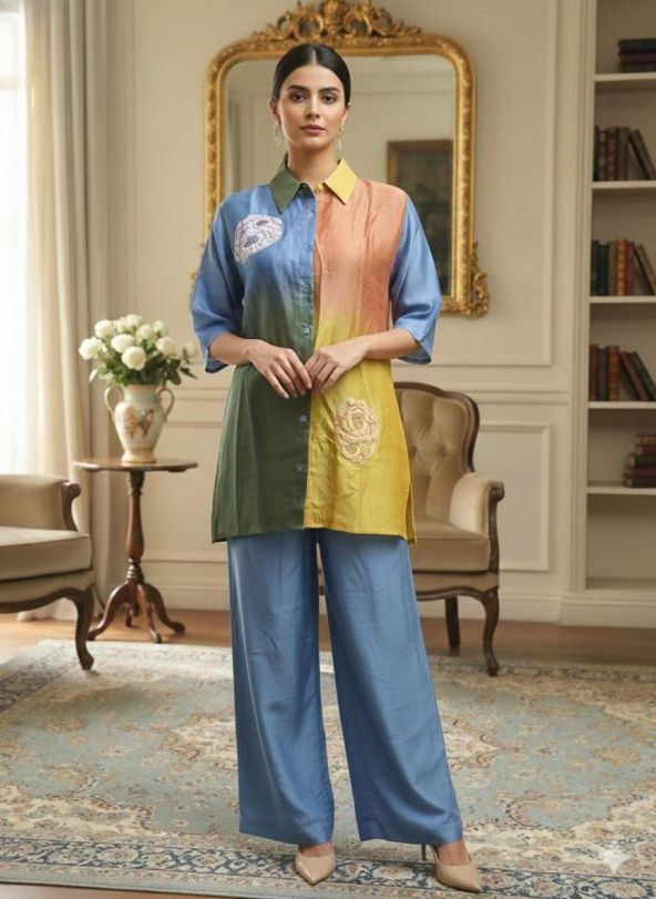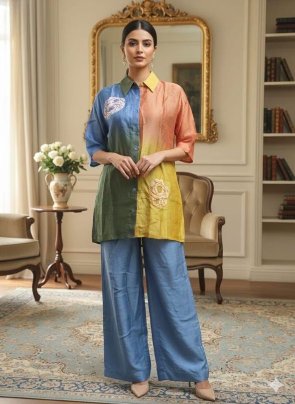 Our Chanderi multi-colour coord set with intricate work details is perfect for summer 💃. Sustainable, easy breezy, and totally summer-friendly 🌞. You'll love the vibrant vibes and comfy feel!